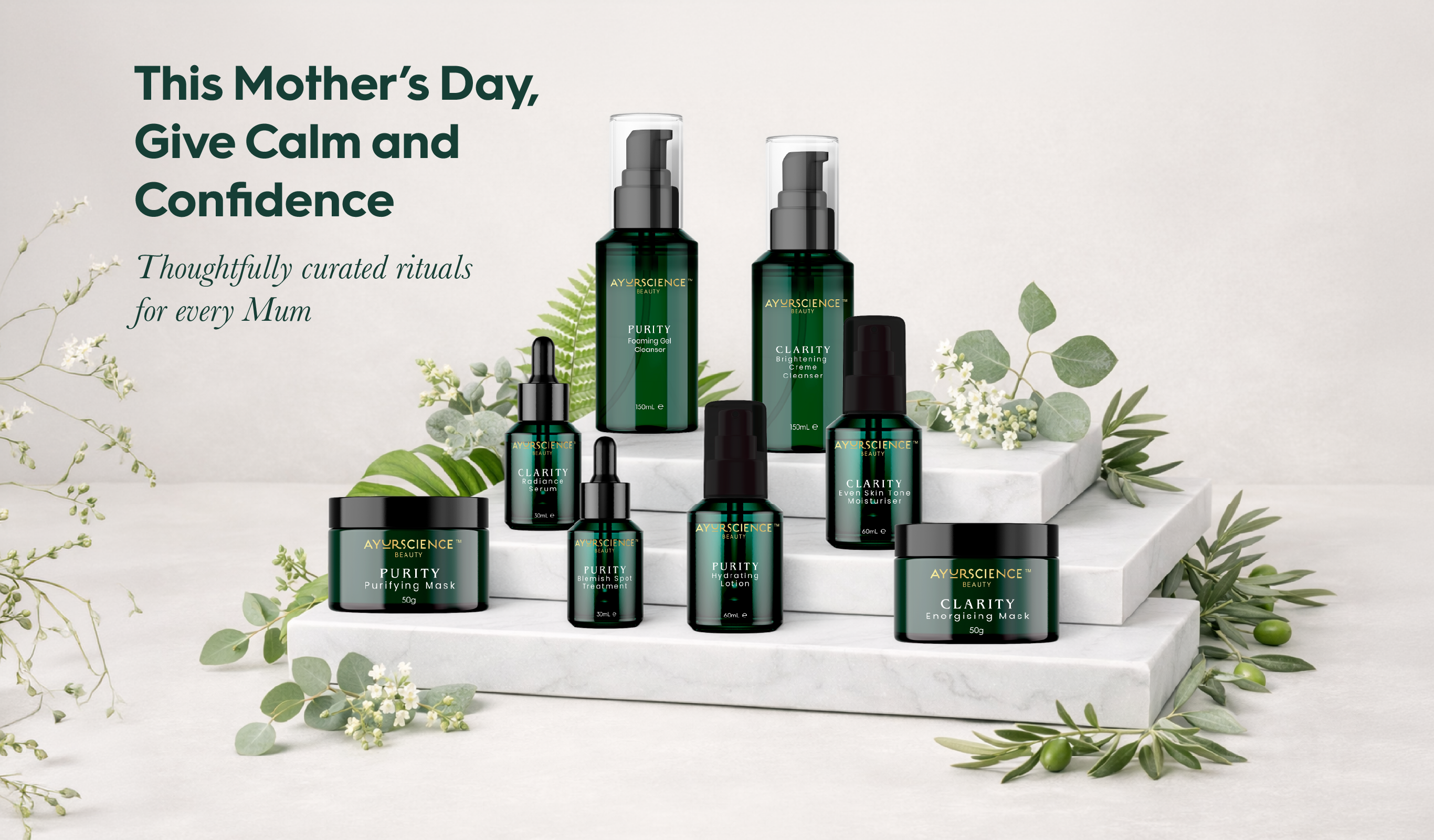 Each range is powered by our proprietary AyurActive™ complex — a blend of potent Ayurvedic herbs such as Amla, Tulsi, Bakuchiol, and Saffron — and infused with AyurScent™, our uplifting essential oil blend that transforms your routine into a sensory experience.