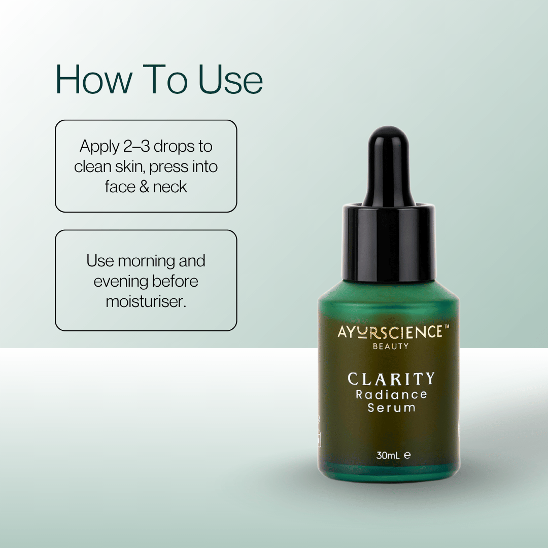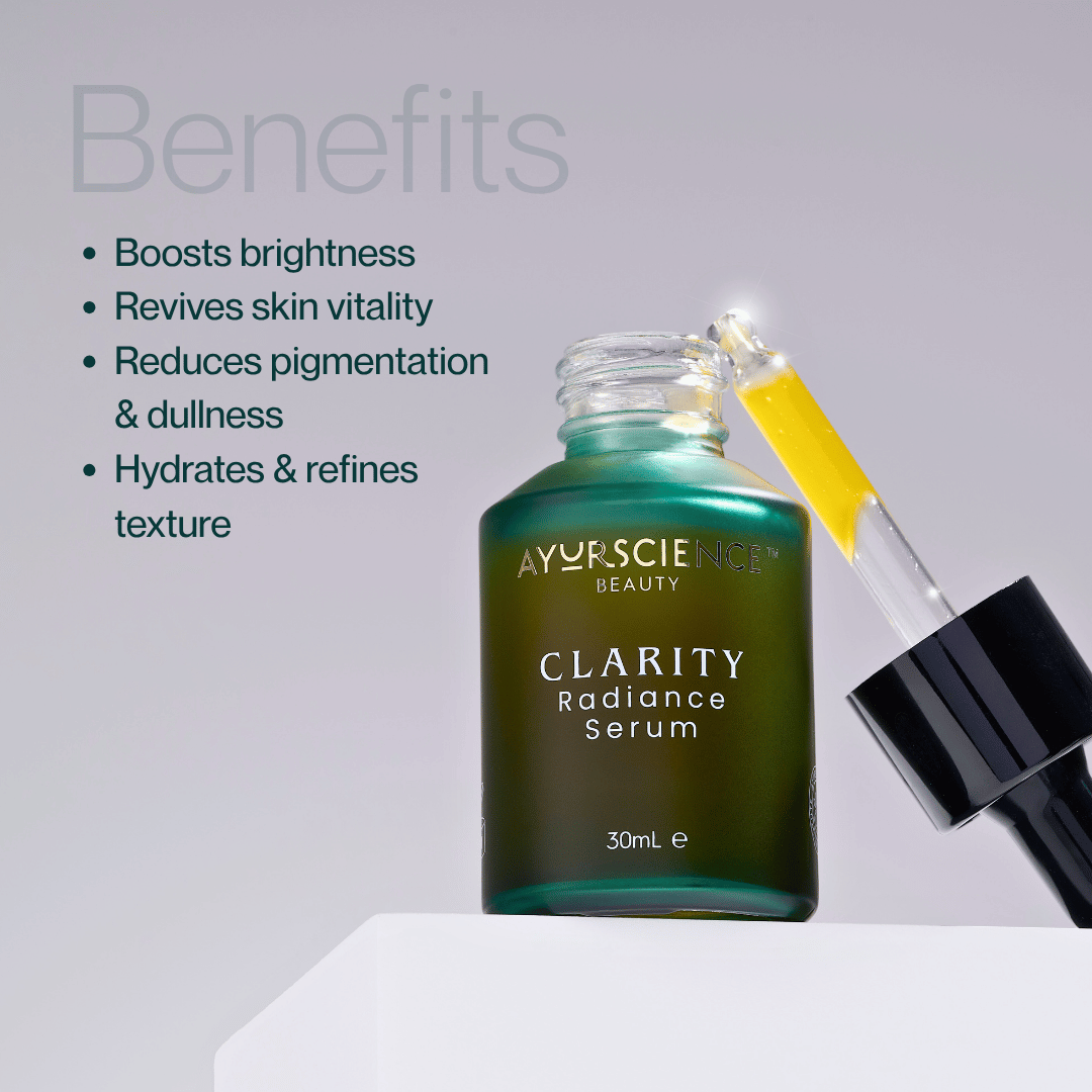 Why you need it: Ayurscience CLARITY Radiance Serum is a gentle yet powerful skin care product for pigmented skin in Australia, formulated with Ayurvedic botanicals and Vitamin C to: