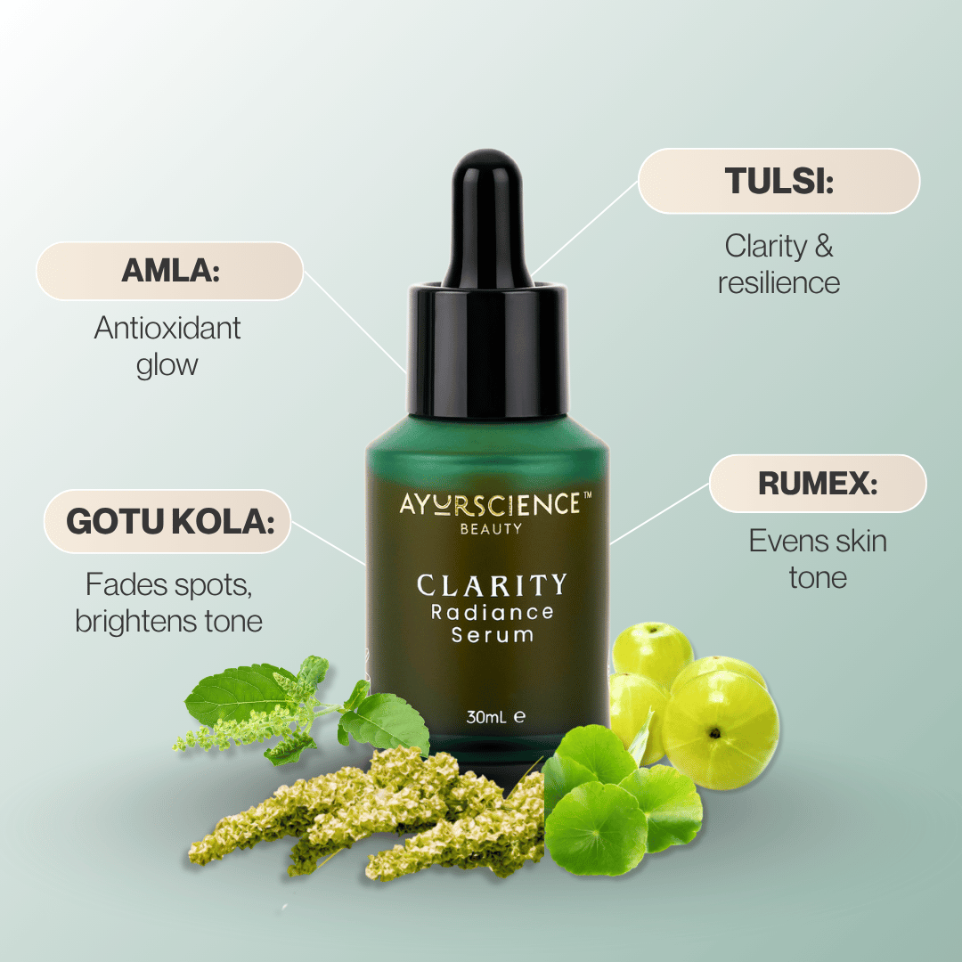 AyurScience Beauty CLARITY Radiance Serum combines our signature Ayur-Active™ amla-tulsi herb complex with Ayurvedic skincare botanicals. Specialised plant-based skincare scientifically supported to target skin redness, pigmentation and irritation: