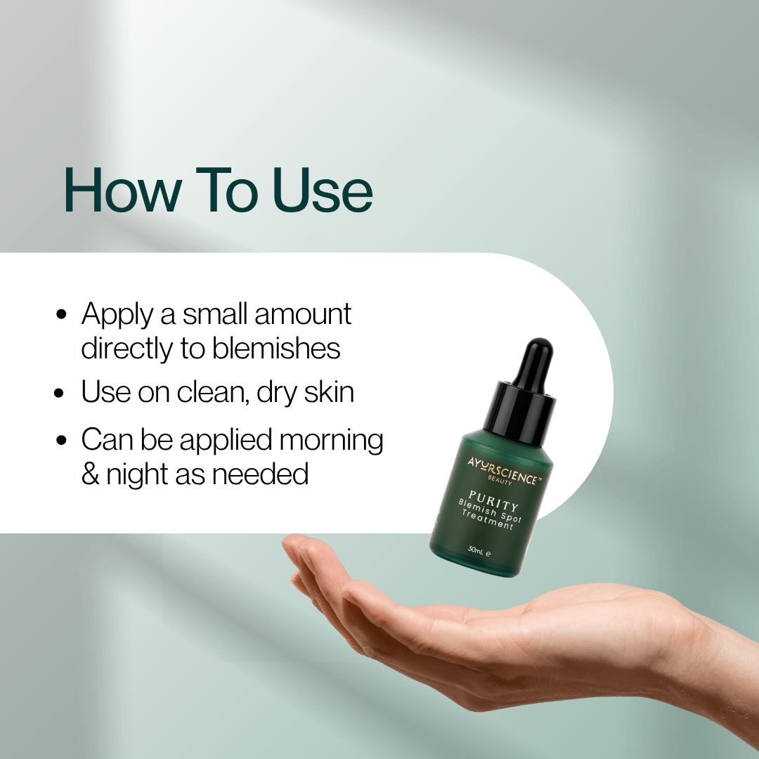 After cleansing skin apply one to three drops directly to affected area (pimple or breakout) with dropper. Using clean hands gently massage into skin using gentle circular motions, avoid rubbing or pressure. Apply AyurScience Beauty PURITY Hydrating Lotion.